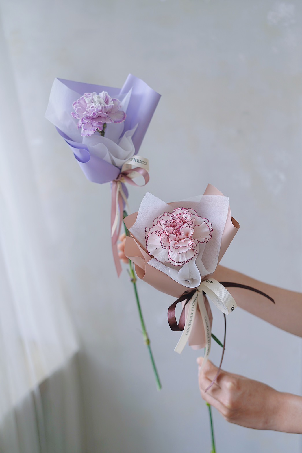 馨情| 經典單朵康乃馨鮮花束 - 優雅粉 / 炙愛紅 / 杏桃粉 / 蕾絲紅 / 夢幻紫 / 甜橙橘