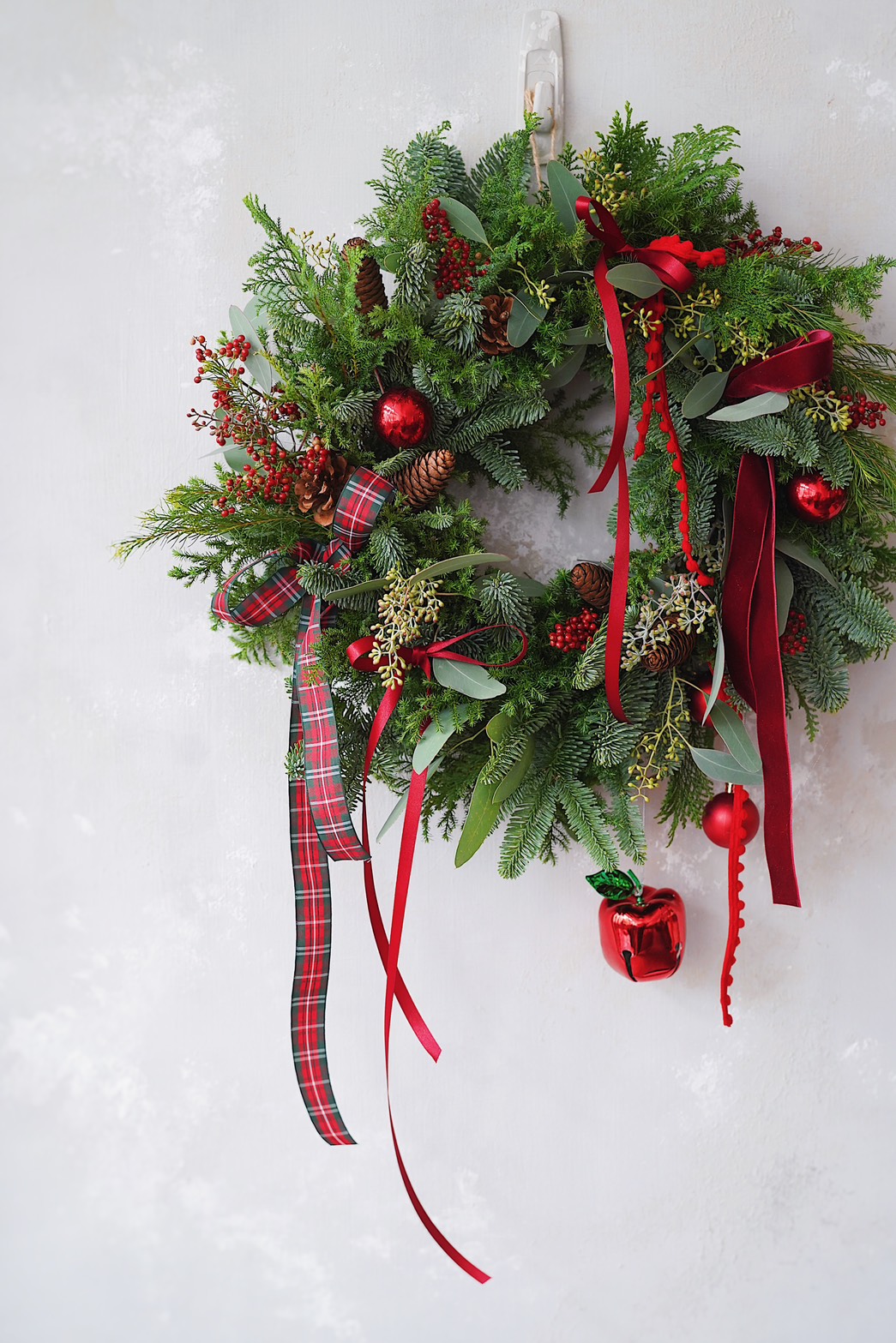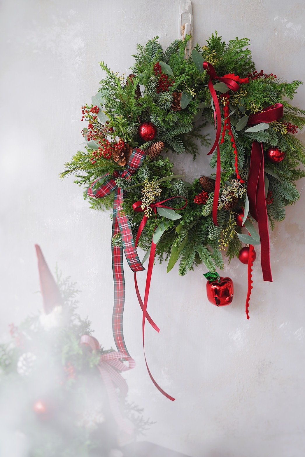 當花圈掛起,光影落在枝葉與蝴蝶結之間